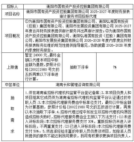 衡陽市國有資產(chǎn)投資控股集團有限公司2025-2027年度財務報表審計服務項目招標代理抽取結(jié)果公示