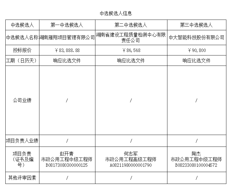 植物園片區(qū)雁云路(幸福河街-紅峰路段)項(xiàng)目檢測單位咨詢服務(wù)比選于2025年08月21日15時(shí)00分在衡陽國投4棟3樓評標(biāo)室進(jìn)行了比選開標(biāo)、評標(biāo)活動,評標(biāo)委員會按照比選文件及相關(guān)法律法規(guī)規(guī)定進(jìn)行評審,推薦以下三名中選候選人(排序),現(xiàn)將相關(guān)信息予以公示。